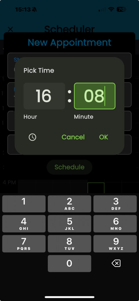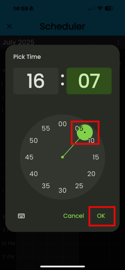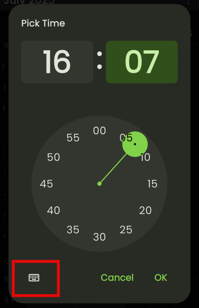 KEEP IN MIND: If you find the dial selector difficult to use, you can switch to the keyboard layout. To do so, tap on the keyboard icon located in the lower left-hand corner of the “Pick Time” dialogue box.
