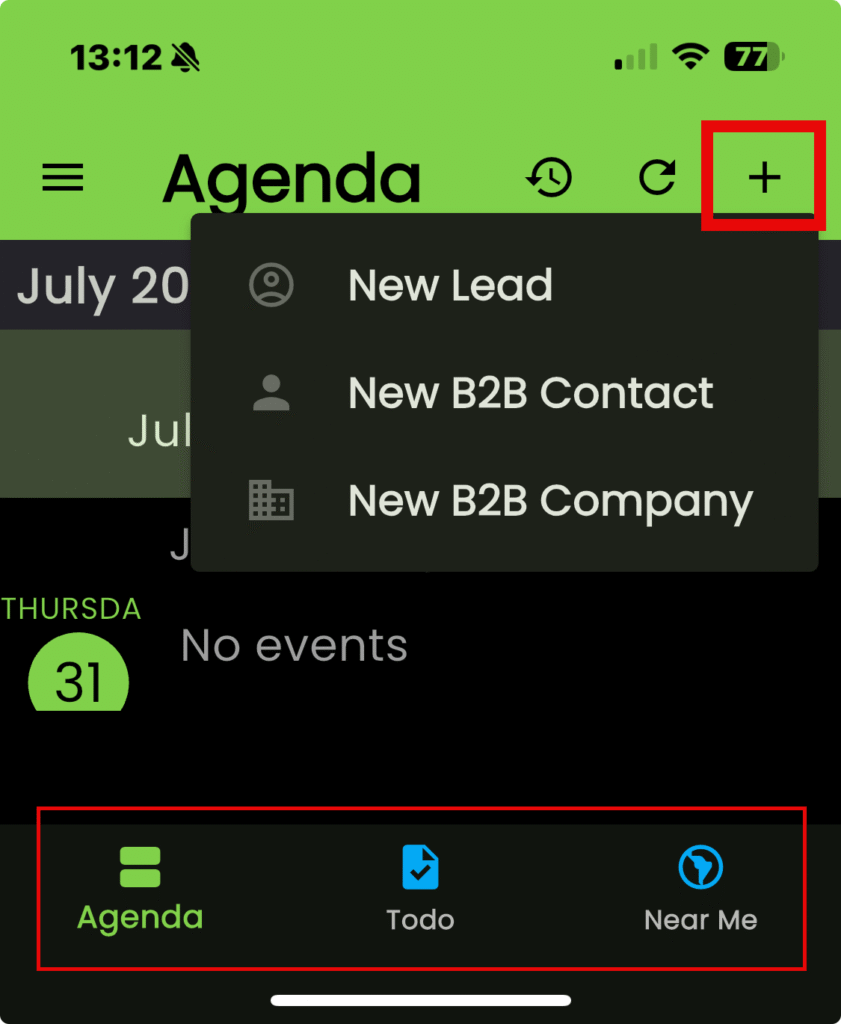 PRO TIP: Alternatively, you can access your lead / customer / B2B contact information by clicking on the “+” icon from any of the three main pages in the OTG app